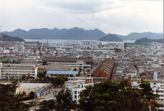 比治山には展望台がありますが、高層ビルの乱立でビルばかりしか見えません。それよりここからの展望を薦めます。すぐ下に今話題の市内一の被爆建物、被服支厰跡が見えます。海岸には元の軍港宇品港市営桟橋が、一番近い島は、陸続きの元宇品、陸軍暁部隊の地下要塞があった所です。海を見れば左から赤いヤグラの立っているのが機密の島、金輪島、そして峠島、その右が検疫所・捕虜収容所・弾薬庫跡があり、多くの被爆者が収容され死んでいった、安芸の小富士とよばれる似島、さらに右は宮島です。見通しの良い日には海軍兵学校(今も海上自衛隊の幹部候補生学校等)で有名な江田島、特攻基地のあった倉橋島も見えます。全て軍事要塞のあった島です。風光明媚な瀬戸の島々、その殆どに、朝鮮人強制労働による地下壕、そして山頂には砲台の跡が(宮島にも)残っており、その多くが現在も呉港を中心に米軍弾薬庫や海上自衛隊の施設に転用されています。 左の写真は1992年12月13日撮影 |