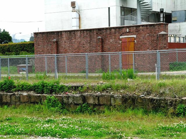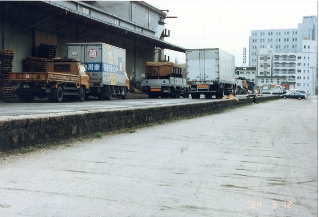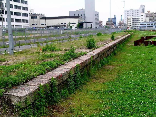 1972年4月に廃止され、駅舎、線路はそれと共に撤去されましたが、ついに1999年に、後ろの糧秣廠倉庫(1997年1月解体)も、この宇品駅跡も撤去されてしまいました。残っていたプラットホームのわずかな縁石も2004年5月10日から18までに、完全に撤去されました。(撤去工事前日に写真に収めました。) なお、ここの海沿いの道路(海岸通り)を北へ行くと、南警察署前に宇品線跡の空地・木柵が残っていましたが2012年行ってみたら消えていました。そのそばには線路とホームのモニュメントが設置されています。 左の写真は1994年3月12日右の建物は糧秣廠倉庫跡(日通倉庫) |