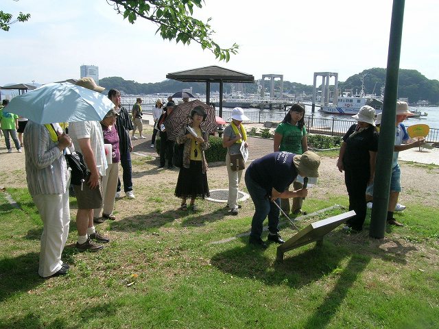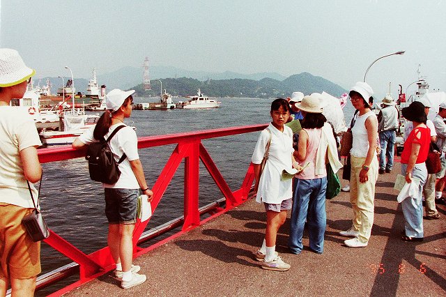 1995年8月6日、フィールドワークは宇品港市営桟橋で。波止場公園が開設されるまでは、立ち入り禁止の倉庫ばかりで、ここからしか昔の軍港の跡は見えませんでした。 |