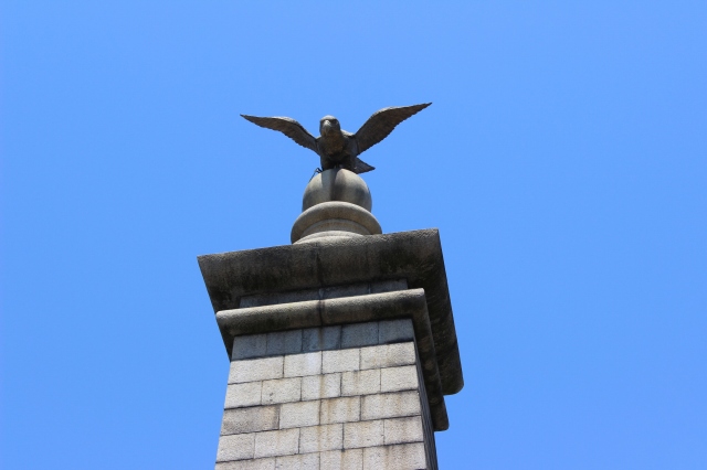1895年7月ここにパリの凱旋門に似た張りぼての仮の凱旋門が作られ、戦勝で沸く市民に迎えられ、軍隊が戦地から帰還しました。翌年10月、この地に軍・官・民三者の手によって、現在の物に建て替えられました。碑の上の球形石の上には両翼を張った鵄(金鵄勲章の金鵄・・・トビということですが、広くはタカの記念碑と呼ばれていた)の鉄像を置きました。戦勝記念碑だけに、太平洋戦争中も金鵄像は金属徴発を免れました。
