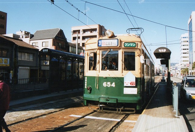 また、被爆電車は現役ですから時々のりあわせることがあります。下の写真は偶然乗り合わせて、御幸橋電停で降りたところで撮影。(2001年冬)