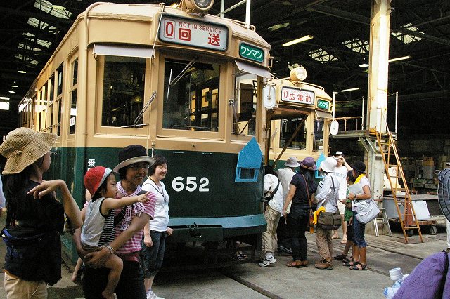 車庫を覗いてみると、廃止された全国の電車や、ドイツの電車等様々な電車の中に、幸運なら今も現役で走っている2両の「651型、652型被爆電車」を見ることができます。2006年春、653型、と654型の2両の被爆電車が現役を引退し、現役引退する2両の車両も「平和学習」には引き続き活用されるそうですが、そのうち654型は交通博物館に移転され、交通博物館で常設屋外展示と報道、、残った現役2両は平和への励ましのメッセージ受け走行中です。