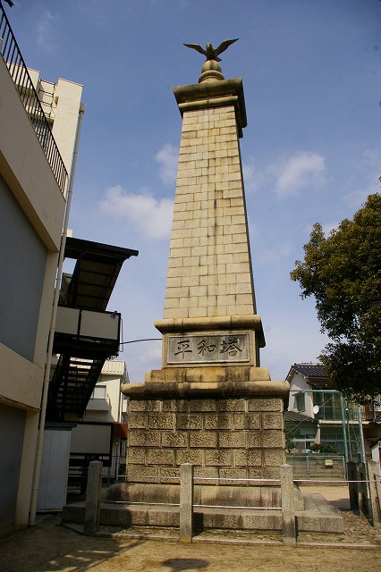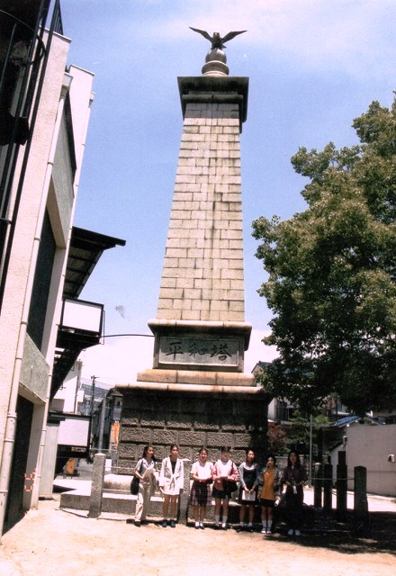 1895年7月ここにパリの凱旋門に似た張りぼての仮の凱旋門が作られ、戦勝で沸く市民に迎えられ、軍隊が戦地から帰還しました。翌年10月、この地に軍・官・民三者の手によって、現在の物に建て替えられました。碑の上の球形石の上には両翼を張った鵄(金鵄勲章の金鵄・・・トビということですが、広くはタカの記念碑と呼ばれていた)の鉄像を置きました。戦勝記念碑だけに、太平洋戦争中も金鵄像は金属徴発を免れました。 1947年、進駐軍にとがめられるのを恐れて、「日清戦争凱旋碑」の文字を落として「平和塔」の文字を入れたといいます。ですが、上の鳥の像は、どう見たって「平和の象徴」の鳩などとは見えない荒々しさを感じさせます。 上の写真1995年広島女学院高校の生徒さんを案内して。下(左)の写真2012年4月25日、 |