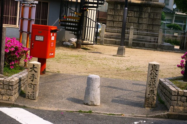 入り口の石門、左は「大手町通」、右は「東松原停車場通」とあります。爆心地から約2.7キロ。石造りのの物としては、被爆遺跡とするには少し遠いですが、戦前はこの回りは畑。この公園と凱旋碑はひときわ高くそびえていました。その時、前を通っていた道路の名前を示しているものと思われます。 2012年5月8日撮影