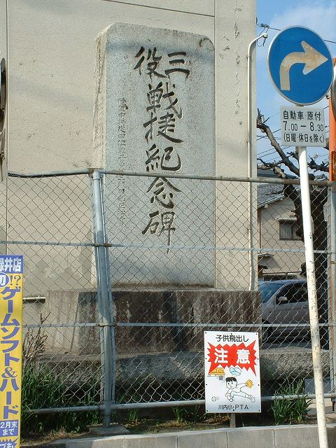 川内小学校のそばを通れば外に向いて堂々と立っている。 表 三役戰捷紀念碑 陸軍中將從四位勲二等功三級 田部正荘書 右 明治四十四年辛亥仲秋 安佐郡川内村 左 明治三十三年戰役從軍、22名の兵士の名前 裏 明治二十七八年戰役從軍、兵士23名の名前、明治三十七八年戰役從軍、兵士67名の名前