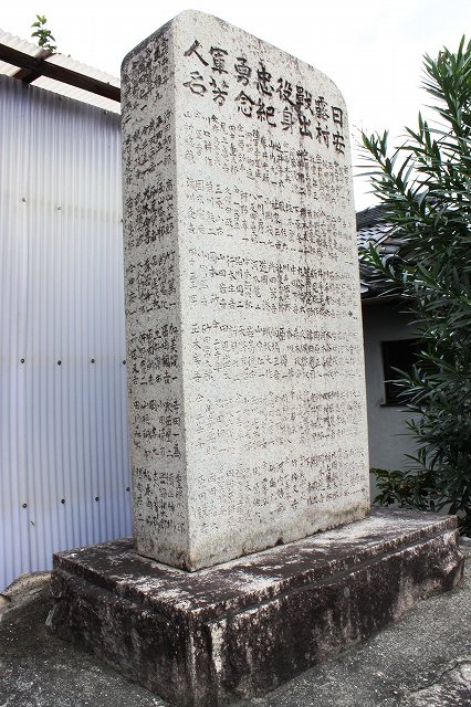 中央に名前 海軍少佐 富士川一吾 仝 上等兵曹 西廣吾六等2名 仝 一等兵曹 牧里行三 仝 一等兵曹 山嵜閲二等2名 仝 一等水兵 迫井五六等3名 仝陸軍三大軍佐 河野郷通 仝 一等卒 田中重太郎等2名 仝 歩兵曹長 2名 仝 軍曹 3名 仝 伍長 2名 仝 上等兵 3名 仝 一等卒 38名 仝 二等卒 12名 仝 騎兵軍曹 1名 仝 騎兵一等卒 2名 仝 砲兵上等兵 3名 仝 一等卒 3名 仝 二等卒 5名 仝 要塞砲兵一等卒5名 仝 工兵曹長 1名 仝 工兵一等卒 2名 仝 工兵二等卒 2名 仝 輜重上等兵 2名 仝 砲兵輸卒 2名 ※建立年月日 明治39年 ※建立の由来 日露戦役に従軍した安村出身者を後世に伝えるために建立された。 ※その他、特記事項 従軍者数は153名で、富士川一吾、田中重太郎などの名前もある。 |