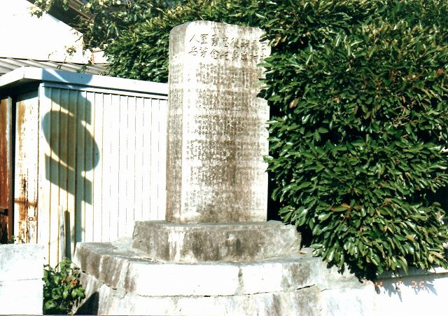 前の「忠魂碑」の安川を挟んで反対側の通りで、安小学校の南東端にあたる。銀山橋の北から少し東。樹木に挟まれて判りにくい。 写真は2013年10月10日撮影。 |