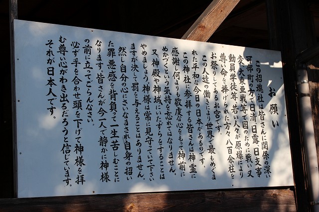 社殿右に看板あり 「お願い」の文句がふるっている。 「お願い この招魂社は皆さんに関係深い可部町の方で日清、日露、日支事変、大東亜戦争で国のために戦い、又動員学徒、若い人々が原爆により尊い命を捧げられた方々八百余柱をお祭りしてあるお宮です。この人達の働きにより世界で最もめぐまれた平和名今日の日本があるのです。この神社に参拝する皆さんは神霊に感謝し何よりも敬虔な心を忘れてはなりません。又神殿や神域にいたずらをすることはやめましょう。神様は常に見守って下さいますが決して罰を与えることはありません。然し自分の心にさいなまれ自身の招いた罪悪感を背負って一生苦しむことになります。皆さんが、今一人で静かに神様の前に立ってごらんなさい。必ず手を合わせ頭を下げて神様を拝む尊い心が出るだろうと信じています。それが日本人です。」 |