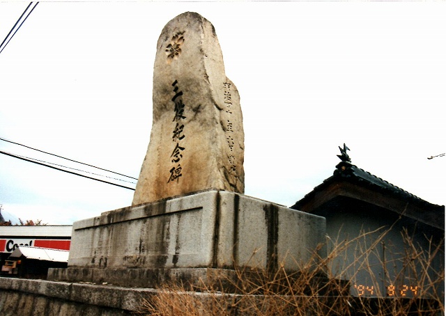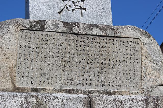 ※建立の由来 この記念碑は三役つまり、明治27,8年の日清戦争(1894〜1895)・同33年の北清事変(1900)・さらに明治37,8年の日露戦争(1904〜5)の戦勝の碑として後世に残そうとして建てられたものである。この記念碑には、当時の三入村(現在の上町屋・下町屋・桐原・南原)の村民中・軍役に参加したものの氏名が記されている。 ※その他の特記事項 碑の本体の下部の前面積が約2メートル・横30センチ・高さおよそ3メートル・用材は、南原山の自然石を村民総出で運んだといわれている。 多くの人の目につき易い場所に明確に残っているのは、村民一致の擁護があったからである。 写真は2013年10月29日撮影。 |