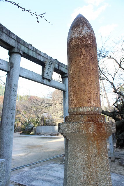 門柱の前に二つの砲弾碑が