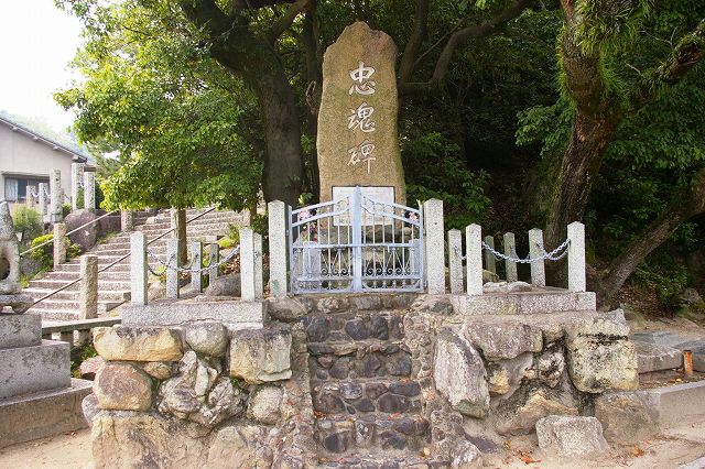 人間魚雷の特攻訓練地区があった倉橋島の大浦崎(現水産試験場・公園)を過ぎて南に行くと、波多見バス停そばに八幡神社があり、その入口にある。左に「鳴乎特殊潜行艇」と書かれた碑と、その裏に人間魚雷の絵図と内容を記した碑があるが。大浦崎特殊潜航艇基地跡(1) にその件について触れているので省略する。