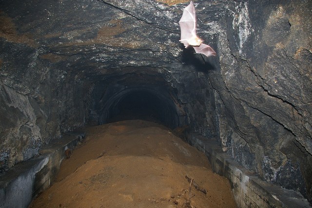 真っ暗な中をコウモリが。 左の写真は2012年5月8日撮影。 繰り返しますが下手な入り方をすると命に関わります。なにせ、真っ暗で、中で事故に会う危険もさることながら、迷ったりしている内に懐中電灯の灯が切れたら、もうおしまい。一人では決して入らないこと。事前に内部の様子を学習し、用意するものがあります。 |