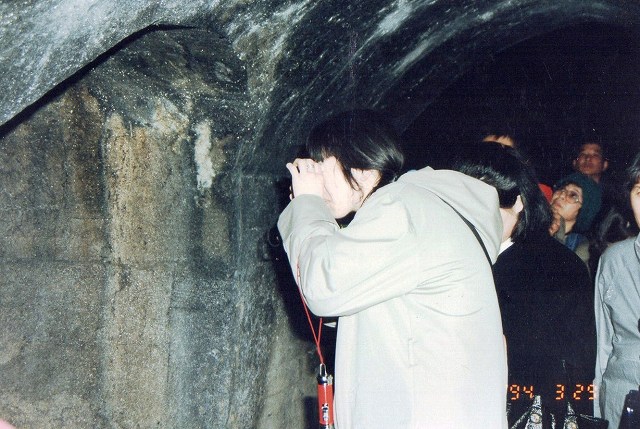 | 観音彫りを覗くフィールドワーク参加者 右の写真は1994年3月29日撮影。 |