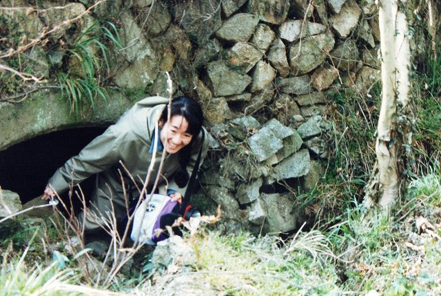 私達「ヒロシマの今から過去を見て回る会」は、この「広島の強制連行を調査する会」についていくことから、その手法を学び、その弟分として誕生した歴史があります。 「海から見る!広島湾スタディクルージング」発足までは、この地下壕への案内を「目玉」として頻繁におこなってきました。膨大な写真をとっていますが、その一部を発表することにしましょう。 場所は、呉から音戸ロッジ方面を更に南東に行くと、バス道路沿いに行くと、右手に呉マリーンが見えます。その反対側の民家裏の山の裾に、良く見ないと判らない、小さな入り口を見つけることが出来ます。バス停では「見晴口」のかなり手前。右の写真のように入り口は狭い。ヤシの木のそばです。 |