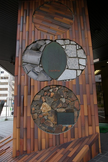 中央、原型を比較的よくとどめている瓦は、広島市の爆心地近くの元安川河床から発掘されたもの。それをとり囲むように配置されている瓦は、長崎市の爆心地松山町から発掘されたものです。