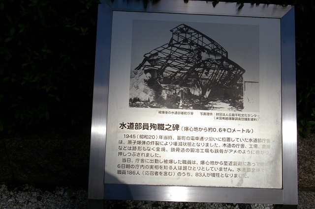 右の説明板「水道部員殉職之碑(爆心地から約0.6キロメートル)