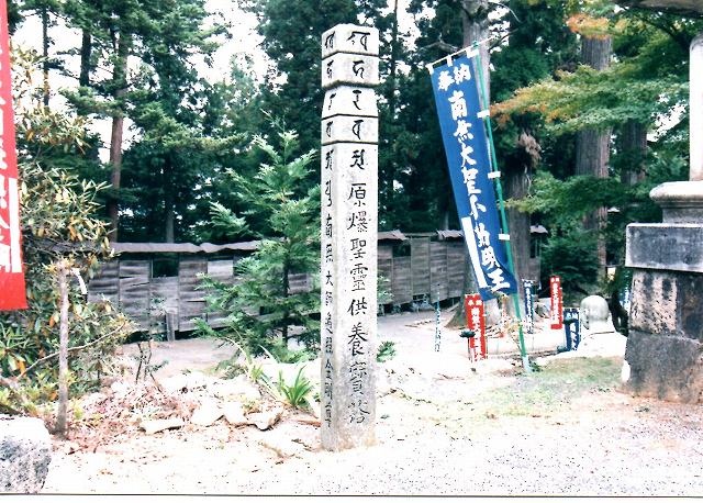 4面に文字が刻んであるが、上の方は天竺文字か。 「原爆精霊供養寶塔」「昭和四十六年八月六日建立」「南無大師遍照金剛尊」「同一性 故入 」とあり、1963年に木碑、1971年に現在の物になったようだ。 |