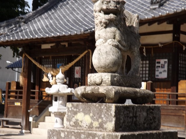 また、戦後建てられた門柱や狛犬が多いですが、中には右の門柱や下の狛犬のように古く、被爆時にあったと想定される門柱・狛犬があります。石造りの遺跡の場合、爆心地から2`以内、ないし全焼区域内のものを言うが、被爆しているには間違いないので一応紹介しておきます。
