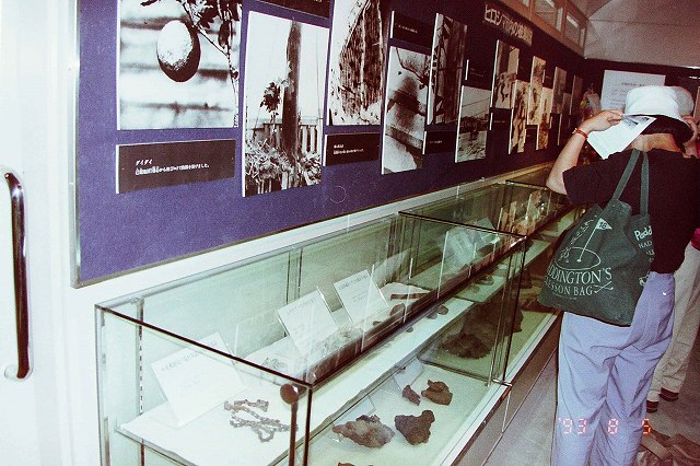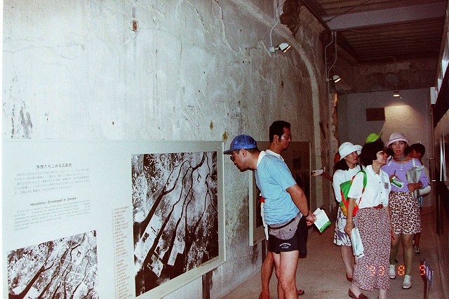 平和公園の西側に位置する本川小学校内にある平和資料館は、爆心地から最も近距離で残存した建物のひとつです。(爆心地から西へ350メートル) 1928年に建設されたこの建物は、当時は市内初の鉄筋コンクリート造の校舎(3階建)として、児童の自慢するところでした。当時は本川国民学校といいました。 あの日、約200名の児童と数名の教職員が登校していました。その他に200名の児童が分散所での授業を受けていたり、建物疎開に動員(高等科の生徒)されていました。あの瞬間、校庭にいたものは即死。校舎内にいた者も即死か大けがをしました。すぐそばを流れる本川に飛び込んだものも多くいましたが、児童、教職員のほとんどが死亡しました。 左の写真は1993年8月5日撮影 |