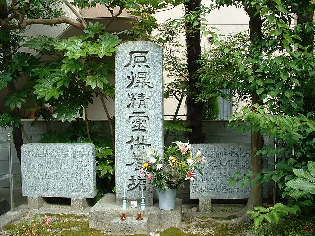 爆心から二百メートル、戦前この辺りは鉄工所が多く、被害も最も大きい地域である。一家全滅・離散、行方もしらず名も知れず痛ましい犠牲者の冥福を祈って縁故者は、浄財を献じ塔を建てた。傍らに、269人の名を刻んだ石がある。この辺りから北西にかけて多くの寺がある。