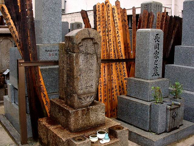 中の方にも被爆墓が少ならず見受けられる。赤黒く変色しひび割れ、「石ハネ現象」を示す爆心地の特徴ある墓がある。 右の写真は2003年7月1日撮影 |