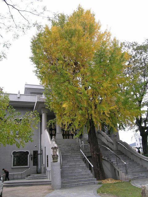 2002年5月8日、フランスのテレビ会社のスタッフがこのイチョウの生命力の強さに焦点を当てた約五十分のテレビ番組を制作するために取材に訪れた、と中国新聞に報じられていました。 爆心から1.1キロぐらいの地で、縮景園のイチョウはすでに紹介していますが、これが9本の被爆イチョウの中でもっとも爆心地に近いそうです。 広島高校生平和ゼミナールの生徒が見つけました。「ヒロシマの子の爆心地レポート、ドキュメンタリー原爆遺跡」というすぐれ本を出していますが、その本には載っていないが、宅和純先生の「碑めぐり」で書いてありました。しかし最初行った時は、葉が落ちていた上に、被爆の痕跡は良く判らず、今まで暖めていたものです。 この寺町地区は大火災になり、黒い幹になったイチョウと、崩れた報専坊、数戸の民家が残るだけだったといいます。寺には現住職の父と母、弟、妹、親類の人の計五人がいたて助かったのは、はりの間にできた空間にいて三日後に救け出された母だけでした。住職の9人の家族は3人だけになりました。 2005年11月13日も見事に色ついています。(左の写真) |