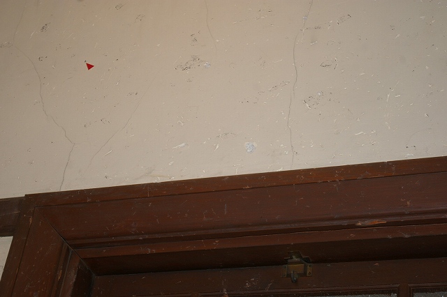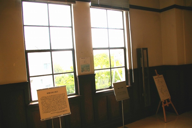 「ガラスが突き刺さった壁 昭和20年8月6日の原爆の爆風により、北側の窓ガラスが吹き飛ばされ、多くの破片がこの壁に突き刺さりました。現在もその痕跡が残っています。」 |