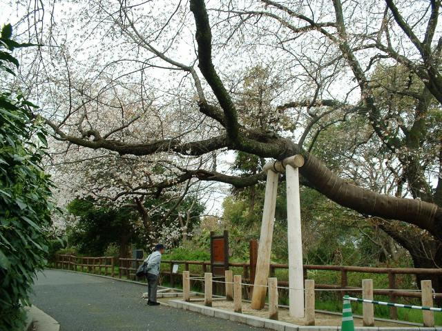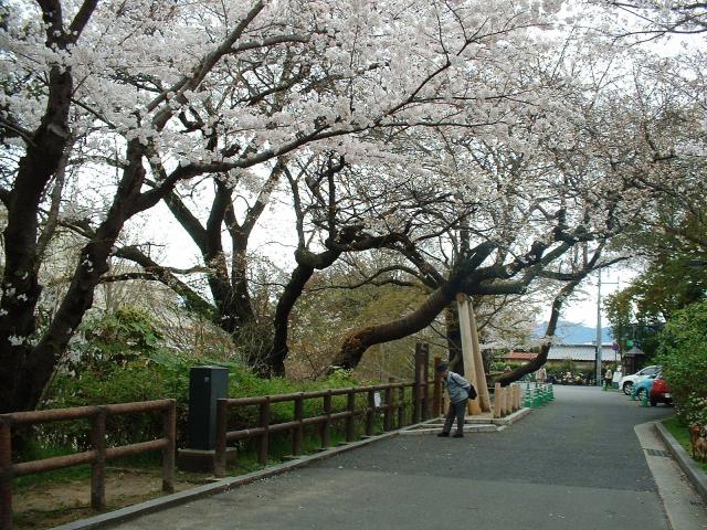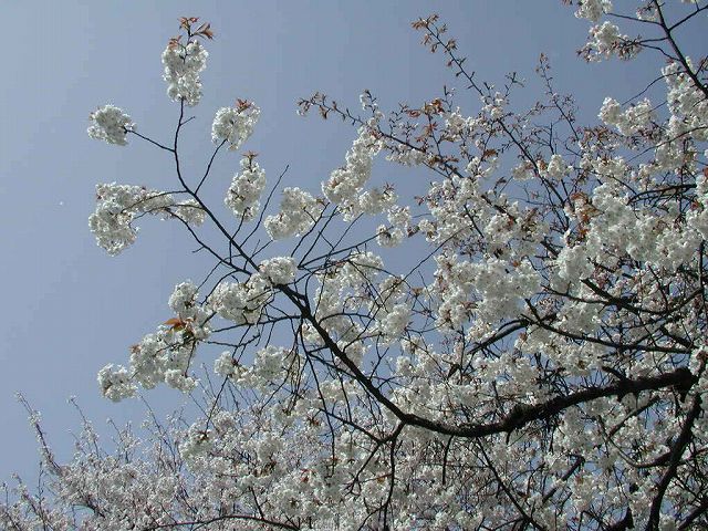 被爆建物「江波山気象館」の入口付近に見事なサクラがあります。樹齢いかほどでしょうか。当然被爆樹でもありますが、全焼地域では無いので、広島市天然記念物の見事さで紹介しましょう。上の写真は2002年春、「今年も咲いたよ」と友人から送られてきたもの、下は筆者が2004年4月3日のフィールドワークで撮ったものです。 桜の花の咲いていないほとんどの時期には旅行者がわざわざ行くほどのものではありませんが、桜の季節には、このサクラを中心に見事な桜の集団を見ることが出来壮観です。季節が会えば「江波山気象館」とセットで言って見る価値は大いにあります。 |