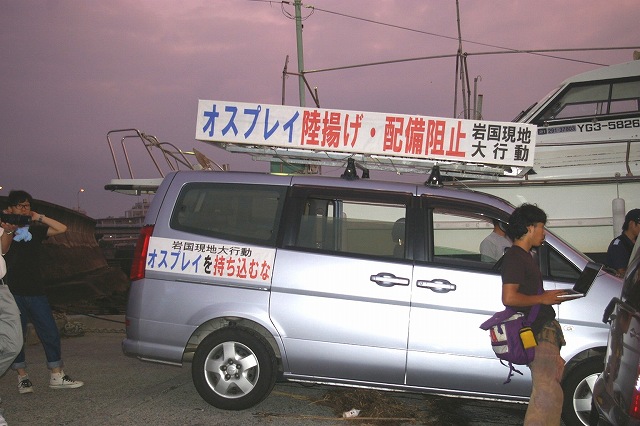 岩国基地の南、門前川河口を挟んだ対岸の船溜まりに海上からの抗議行動の為、午前4時30分に集合。 5時5分、岩国基地沖を岩国基地に向けて航行するオスプレイを積んだ輸送船グリーンリッジを確認。 2012年7月23日中国新聞ホームページ、同 同全国版に出ています。 2012年7月23日朝日新聞ホームページ に出ています。 2012年7月23日毎日新聞ホームページ に出ています。 2012年7月23日読売新聞ホームページ に出ています「。 |