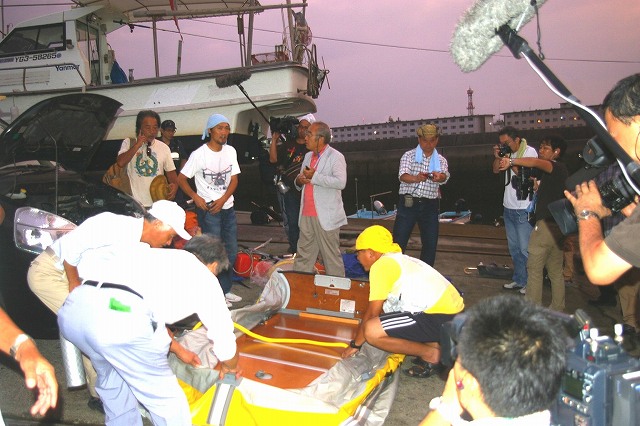 5時27分、広兼隆充さんの漁船で、地元岩国の田村順玄さん、岡村寛さん、藤川俊雄さん等6人が、グリーンリッジ(輸送船確認)の為出航。 |