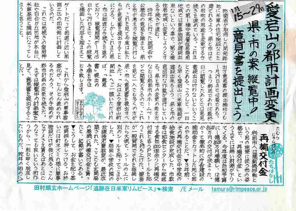 黒磯町の大国幸子さんから、「意見書」を集めて回った経験から、「愛宕山を愛する皆様へ」は、「岩国を愛する皆様へ」の方が良かったのではないかと、意見を言われました。 |