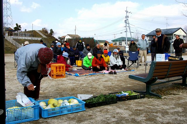 広兼隆充さんからいつものように野菜の差し入れ。このあと周防大島の方からミカンが差し入れられ、多くの方が食べました。 |