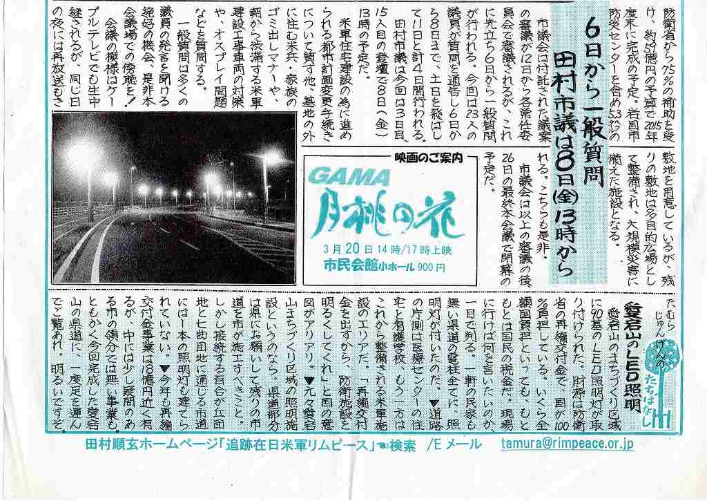 (2013年3月1日 「おはよう愛宕山」 第437号 ) 3月議会スタート 一般会計は605億円 愛宕山へは消防防災センター建設など ー21日まで24日間開催ー 岩国市議会3月定例会が2月26日から始まった。3月議会は新年度の各種会計予算案件が集中し、今回も74本の議案や諮問・報告などが21日まで24日間の日程で審議される。 岩国市の13年度一般会計予算は605億円、昨年度の岩国錦帯橋空港への貸付金などが終わり4年ぶりに昨年度比1.1%の減額予算だ。 しかし公共下水道や介護保険など14の特別会計は22%8億6000万円増額され415億円となり、予算の総合計は1,021億円になった。 新年度も防衛相からの交付金や補助金事業が施策の中心に座り、空母艦載機の岩国移駐を既成事実にする事業のオンパレードだ。 その一つが愛宕山街づくりの残りの事業「岩国消防防災センター」の建設である。無線のデジタル化に対応し、三つの消防署を統合した消防庁舎に併設した災害体験学習も出来る防災拠点施設の建設だ。 岩国消防防災センターは防衛相から75%の補助を受け、約59億円の予算で2015年度末に完成の予定。岩国市防災センターを含め5.3ヘクタールの敷地を用意しているが、残りの敷地は多目的広場として整備され、大規模災害に備えた施設となる。 6日から一般質問 田村市議は8日(金)13時から 市議会は付託された議案の審議が12日から各常任委員会で審議されるが、これに先立ち6日から8日まで、土日を飛ばして11日と計4日間行われる。 田村市議は今回は3日目、15人目の登壇で8日(金)13時の予定だ。 米軍住宅建設の為に進められる都市計画変更手続きについて質す他、基地の外に住む米兵・家族のゴミ出しマナーや、朝から渋滞する米軍建設工事車両の対策や、オスプレイ問題などを質問する。 一般質問は多くの議員の発言を聞ける絶好の機会、是非本会議場での傍聴を! 会議の模様はケーブルテレビでも生中継されるが、同じ日の夜には再放送もされる。こちらも是非。 市議会は以上の審議の後、26日の最終本会議で閉幕の予定だ。 発行所 『おはよう愛宕山新聞社』〒741-0071℡&Fax 0827-31-3383 岩国市牛野谷町3-75-10 郵便振替01510-0-19089 |