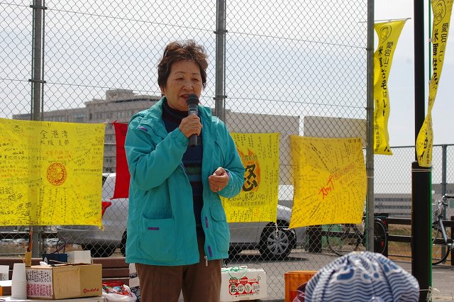 幟旗101本分のカンパを集め持ってきたと説明される麻田茂樹さん。「岩国労働者反戦交流集会」の方で、白松哲夫さん、板橋めぐみさん等のAWCと共闘関係にあるそうです。 |