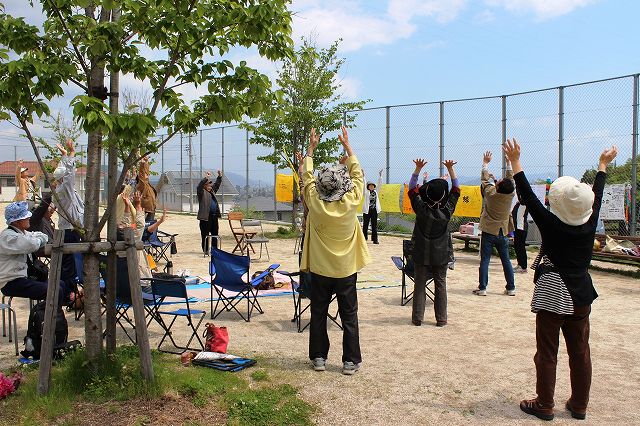 広兼さんの奥さんの」リードでリラックス体操。 |