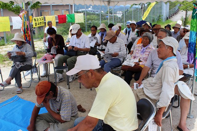 田村市議が世話人を務めるピースリンク広島・呉・岩国は今回もゴムボート船団を繰り出し、午前7時ころから海上での抗議アピールを展開した。また午前10時からは市内5つの市民団体が呼びかけ、尾津沖堤防道路1.2kmを抗議のパレードをした。