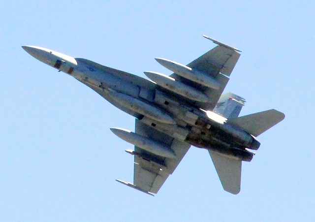 米海兵隊 F/A-18D ホーネット戦闘攻撃機 (岩国基地)が頭の上を。多くのカメラがシャッターを切ります。 |