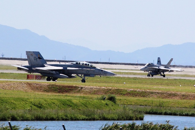 さきほど飛んでいった米海兵隊 F/A-18D ホーネット戦闘攻撃機 (岩国基地)の一部が帰りました。滑走路を進みます。 |