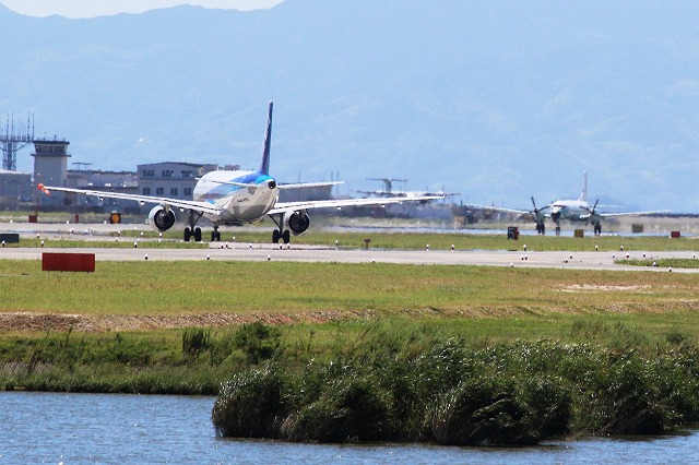 そこに右の機が邪魔するように降りてきました。全日空旅客機定期便はとまって待ちます。 |