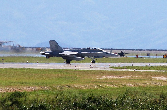次々に米海兵隊 F/A-18D ホーネット戦闘攻撃機(岩国基地)が戻り、マニアのみなさんのカメラを引き付けます。 |