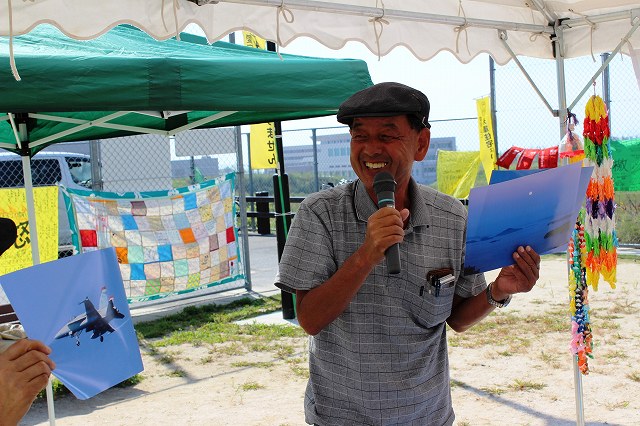 翌日の周防大島の文珠山では河井一志さんの骨折りで、滝内チヨノさんから、オスプレイ、ホーネットが轟音をたてて飛び回っているとのお話しを聞き、茶がゆや塩アンのおはぎをごちそうになったこと、文珠山頂上からは岩国基地がヘリでも借りたようにとても良く見えてびっくりしたこと、そこに岩国基地から飛び立ったホーネット6機が旋回飛行をするのを目撃した事など昨日撮った写真を提示しながら説明。