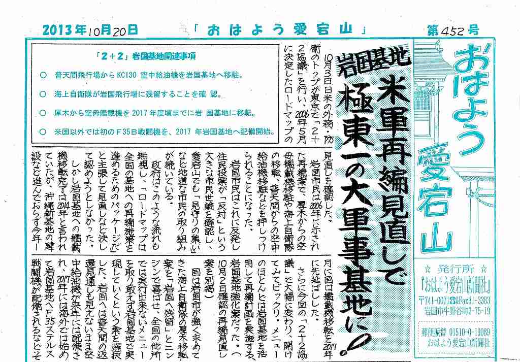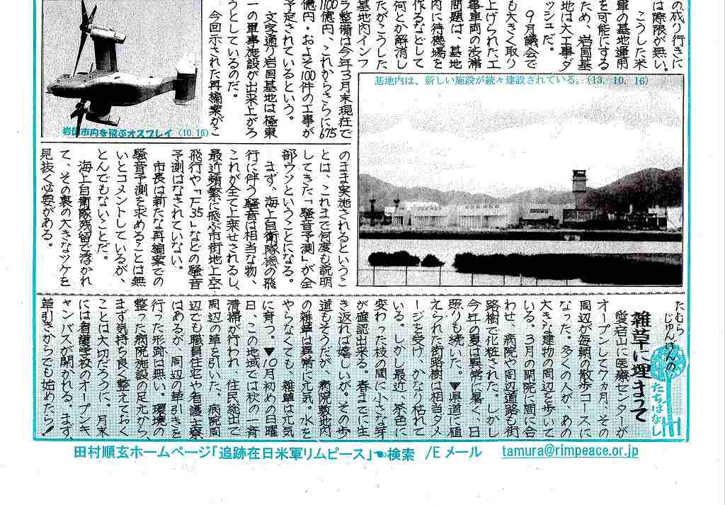 「住民投票を力にする会」として藤本博司さんが10月18日に「KC-130空中給油機の岩国への先行移駐に反対する申し入れ」を行った旨を報告されました。 2013年10月19日付け中国新聞ホームページに出ています。 |