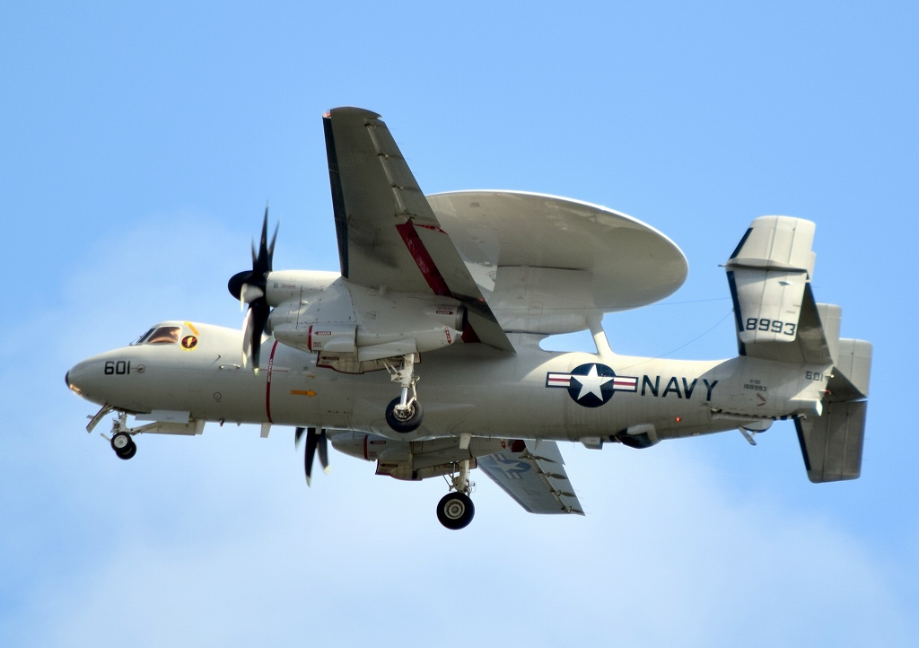 米海軍艦載機 E-2D ホークアイ 早期警戒機、601番機が旋回、2周目