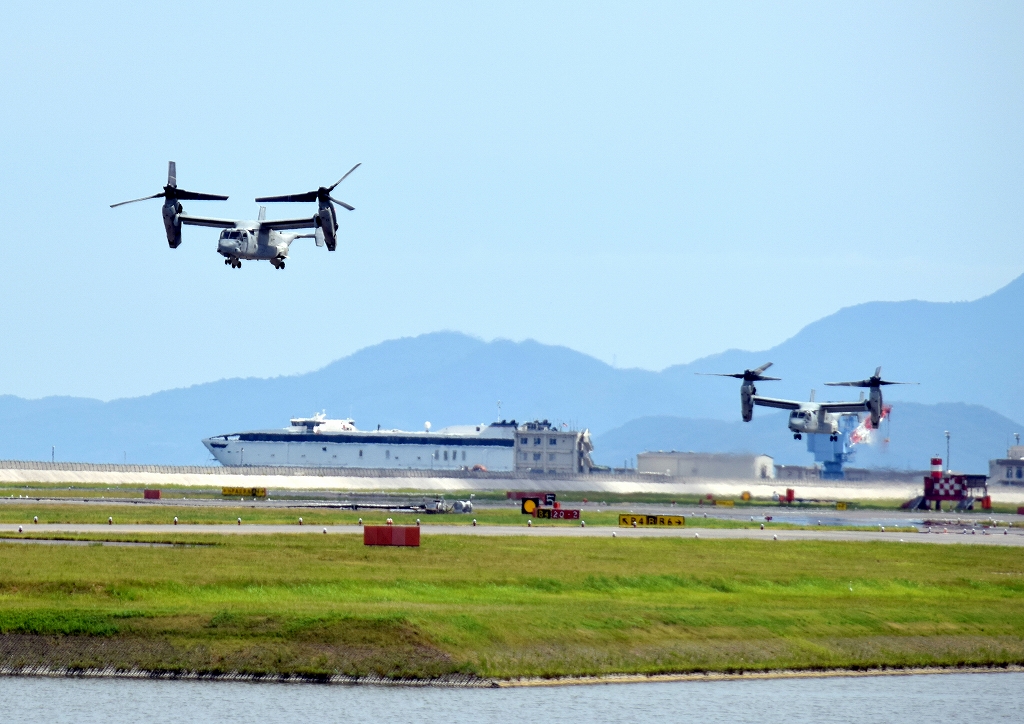 米海兵隊 MV-22B オスプレイ(普天間基地)、「虎」、02番機、03番機が離陸 。下にウェストパック・エクスプレス