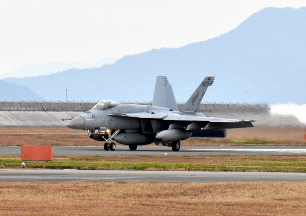 米海軍艦載機 F/A-18E スーパーホーネット 戦闘攻撃機、NF、411番機が着陸