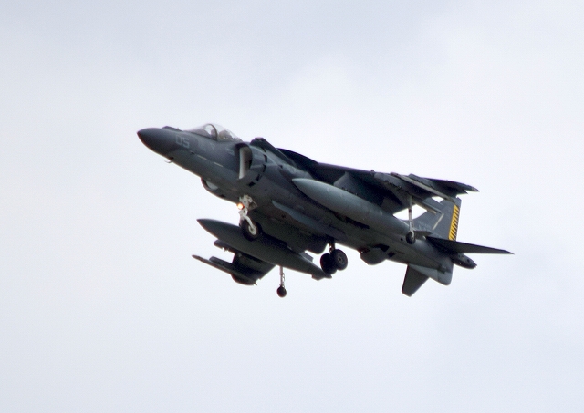 米海兵隊 AV-8B ハリアー2 攻撃機(岩国基地)、WH、05番機は旋回(4周目) |
