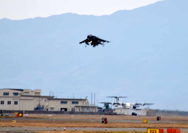 米海兵隊 AV-8B ハリアー2 攻撃機(岩国基地)、WH、03番機は旋回(3周目) |