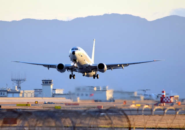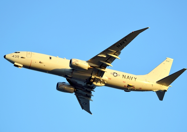 米海軍 P-8A 対潜哨戒機 ポセイドン(嘉手納基地)、439番機が旋回(4周目) |