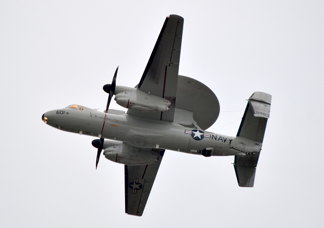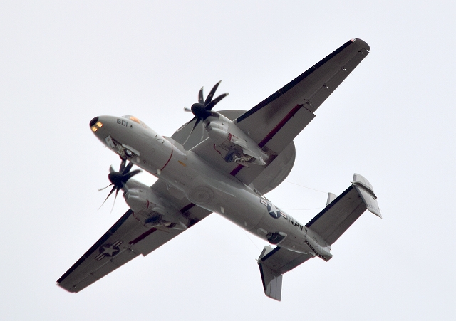 米海軍艦載機 E-2D ホークアイ 早期警戒機、601番機が旋回(4周目) |