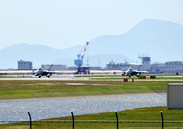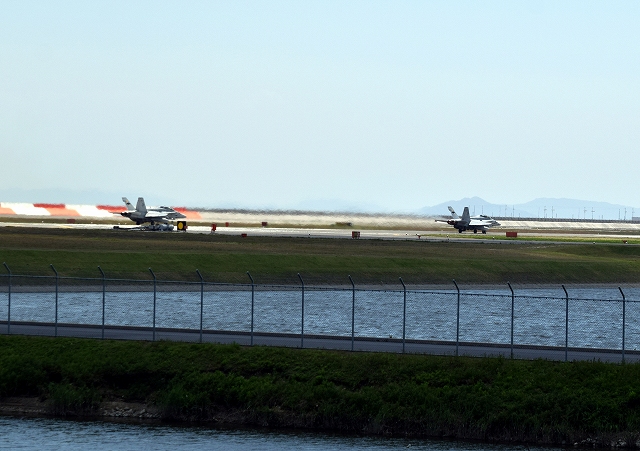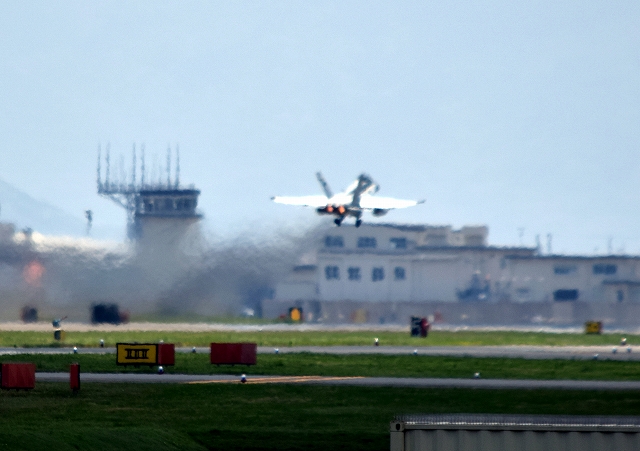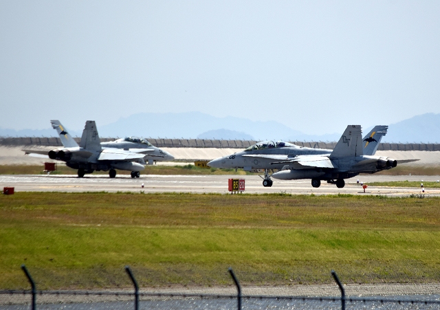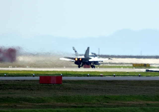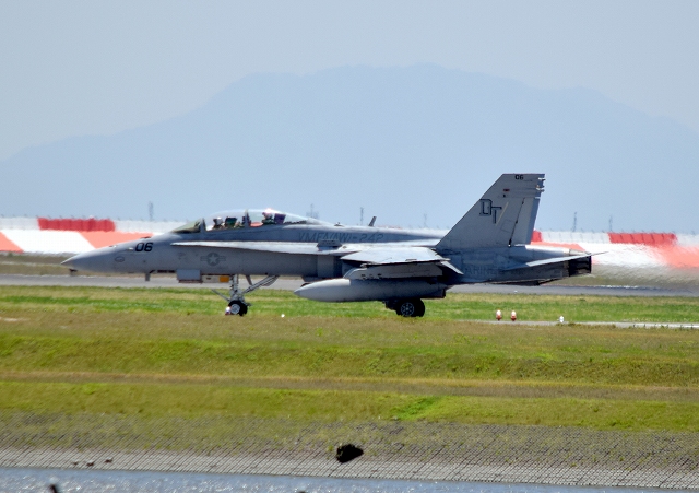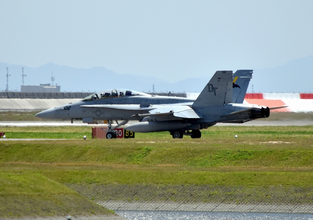 米海兵隊 F/A-18D ホーネット 戦闘攻撃機(岩国基地)、DT、02番機が離陸 |